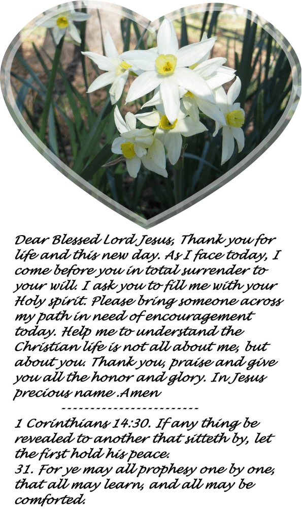 Dear Blessed Lord Jesus, Thank you for life and this new day. As I face today, I come before you in total surrender to your will. I ask you to fill me with your Holy Spirit. Please bring someone across my path in need of encouragement today. Help me to understand the Christian life is not all about me, but about you. Thank you, praise, and give you all the honor and glory. In Jesus’s precious name Amen.