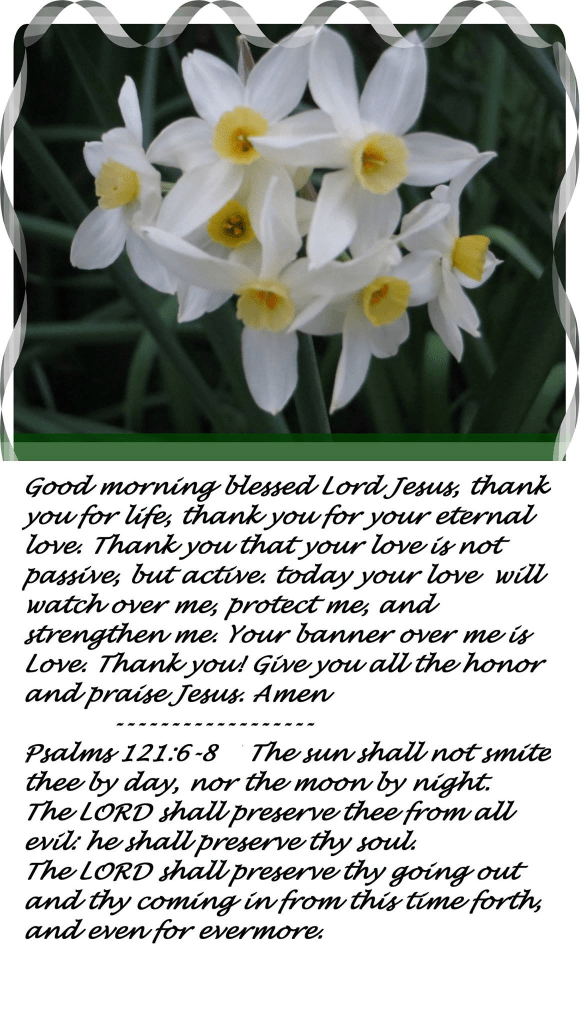 Good morning blessed Lord Jesus, thank you for life, thank you for your eternal love. Thank you that your love is not passive, but active. today your love will watch over me, protect me, and strengthen me. Your banner over me is Love. Thank you! Give you all the honor and praise Jesus Amen.