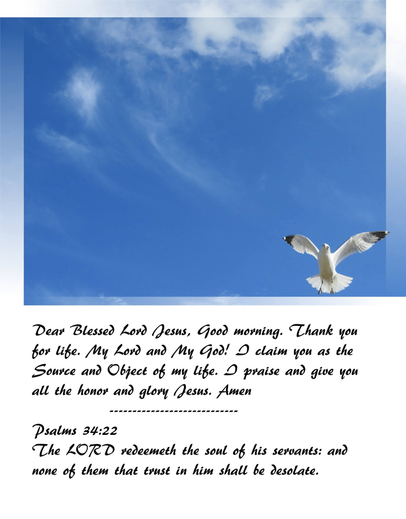 Dear Blessed Lord Jesus, Good morning. Thank you for life. My Lord and My God! I claim you as the Source and Object of my life. I praise and give you all the honor and glory Jesus. Amen.