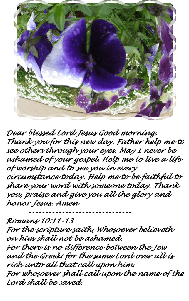 Dear Blessed Lord Jesus Good morning. Thank you for this new day. Father help me to see others through your eyes. May I never be ashamed of your gospel? Help me to live a life of worship and to see you in every circumstance today. Help me to be faithful to share your word with someone today. Thank you, praise, and give you all the glory and honor of Jesus Amen.