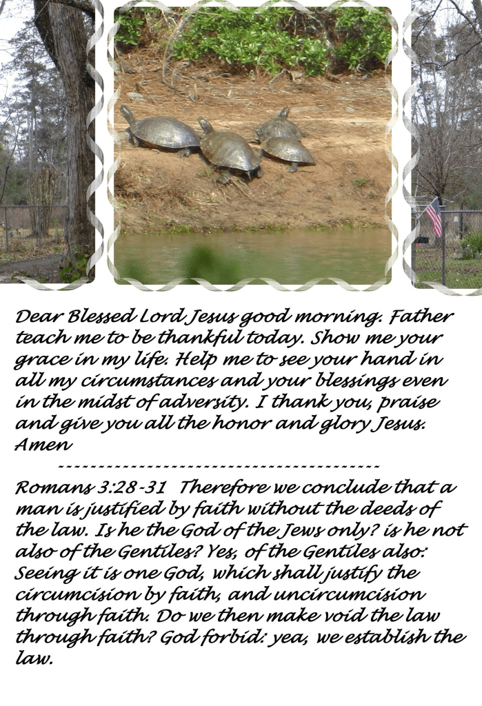Dear Blessed Lord Jesus good morning. Father teach me to be thankful today. Show me your grace in my life. Help me to see your hand in all my circumstances and your blessings even amid adversity. I thank you, praise and give you all the honor and glory Jesus. Amen.