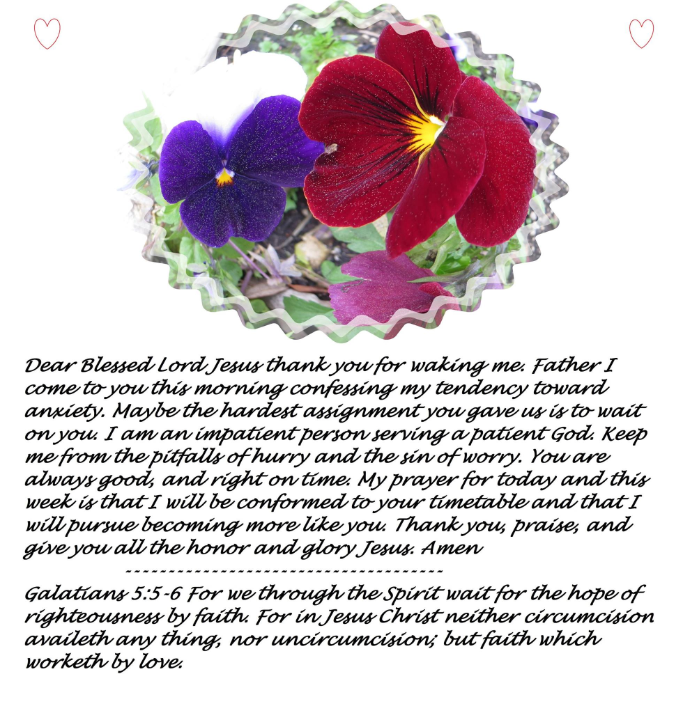 Dear Blessed Lord Jesus thank you for waking me. Father, I come to you this morning confessing my tendency toward anxiety. Maybe the hardest assignment you gave us was to wait on you. I am an impatient person serving a patient God. Keep me from the pitfalls of hurry and the sin of worry. You are always good, and right on time. My prayer for today and this week is that I will conform to your timetable and that I will pursue becoming more like you. Thank you, praise, and give you all the honor and glory Jesus. Amen.