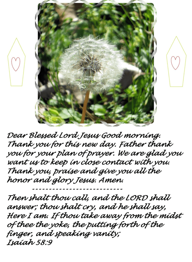 Dear Blessed Lord Jesus Good morning. Thank you for this new day. Father thank you for your plan of prayer. We are glad you want us to keep in close contact with you. Thank you, praise, and give you all the honor and glory Jesus. Amen.