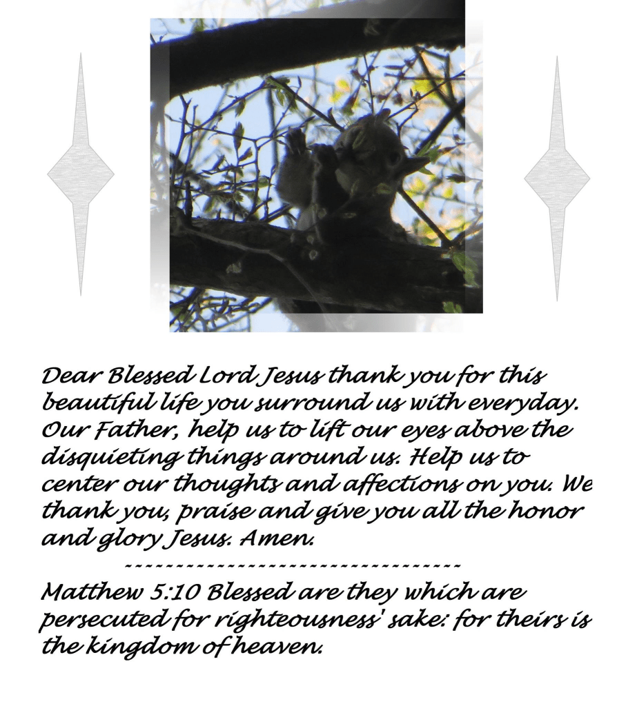 Dear Blessed Lord Jesus thank you for this beautiful life you surround us with every day. Our Father, help us to lift our eyes above the disquieting things around us. Help us to center our thoughts and affections on you. We thank you, praise and give you all the honor and glory Jesus. Amen.