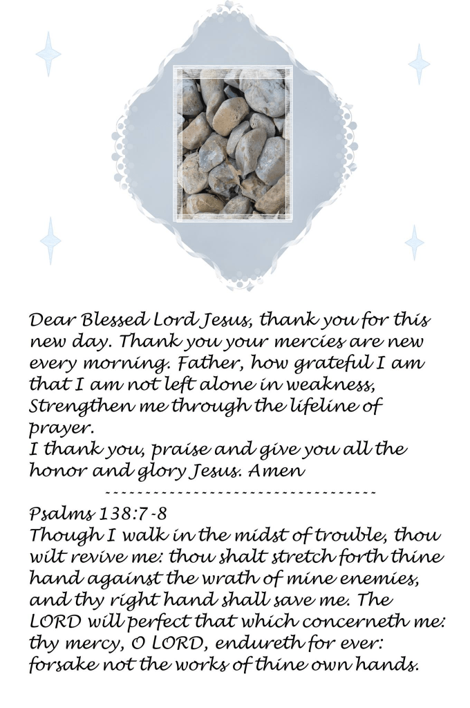 Dear Blessed Lord Jesus, thank you for this new day. Thank you your mercies are new every morning. Father, how grateful I am that I am not left alone in weakness, Strengthen me through the lifeline of prayer. I thank you, praise and give you all the honor and glory Jesus. Amen.