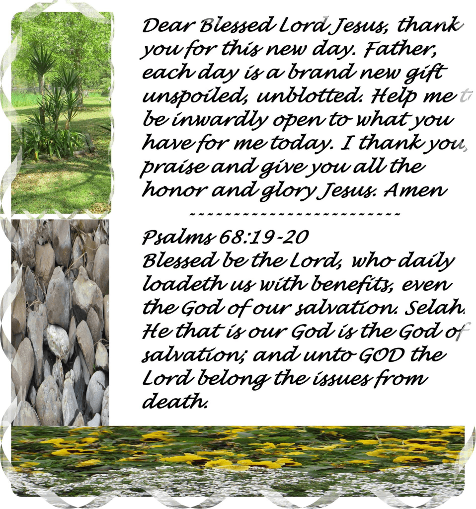 Dear Blessed Lord Jesus, thank you for this new day. Father, each day is a brand new gift unspoiled, unblotted. Help me to be inwardly open to what you have for me today. I thank you, praise and give you all the honor and glory Jesus. Amen.