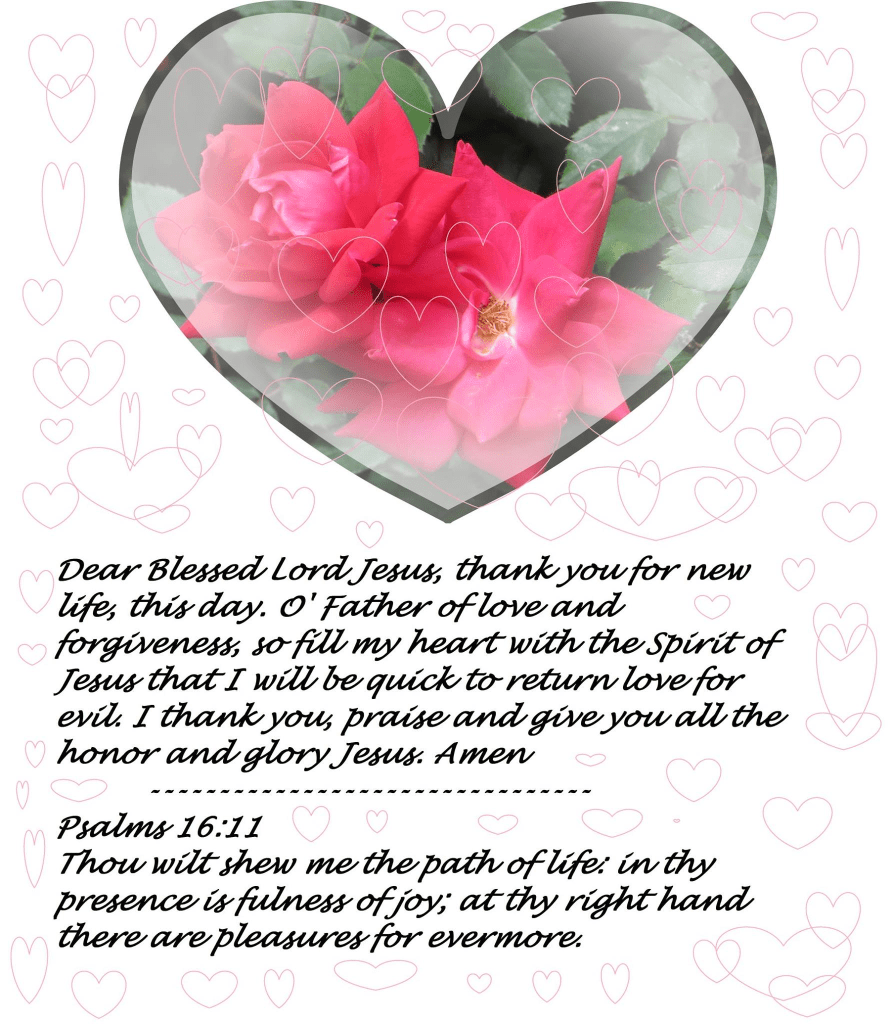Dear Blessed Lord Jesus, thank you for new life, on this day. O’ Father of love and forgiveness, so fill my heart with the Spirit of Jesus that I will quickly return love for evil. Thank you, praise, and give you all the honor and glory Jesus. Amen.