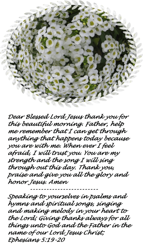 Dear Blessed Lord Jesus thank you for this beautiful morning. Father, help me remember that I can get through anything that happens today because you are with me. Whenever I feel afraid, I will trust you. You are my strength and the song I will sing throughout this day. Thank you, praise, and give you all the glory and honor of Jesus. Amen.