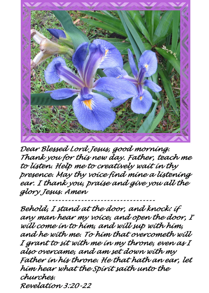 Dear Blessed Lord Jesus, good morning. Thank you for this new day. Father, teach me to listen. Help me to creatively wait in thy presence. May thy voice find mine a listening ear. I thank you, praise and give you all the glory Jesus. Amen.