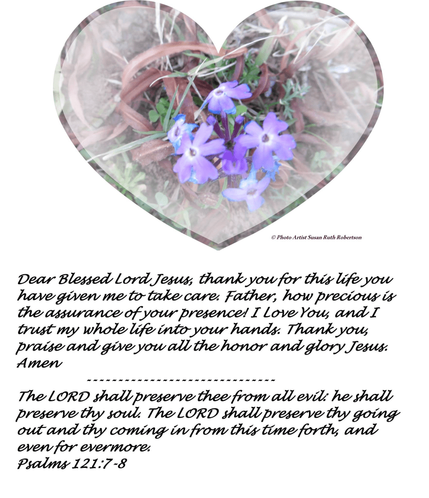 Dear Blessed Lord Jesus, thank you for this life you have given me to take care. Father, how precious is the assurance of your presence! I Love You, and I trust my whole life into your hands. Thank you, praise and give you all the honor and glory Jesus. Amen.