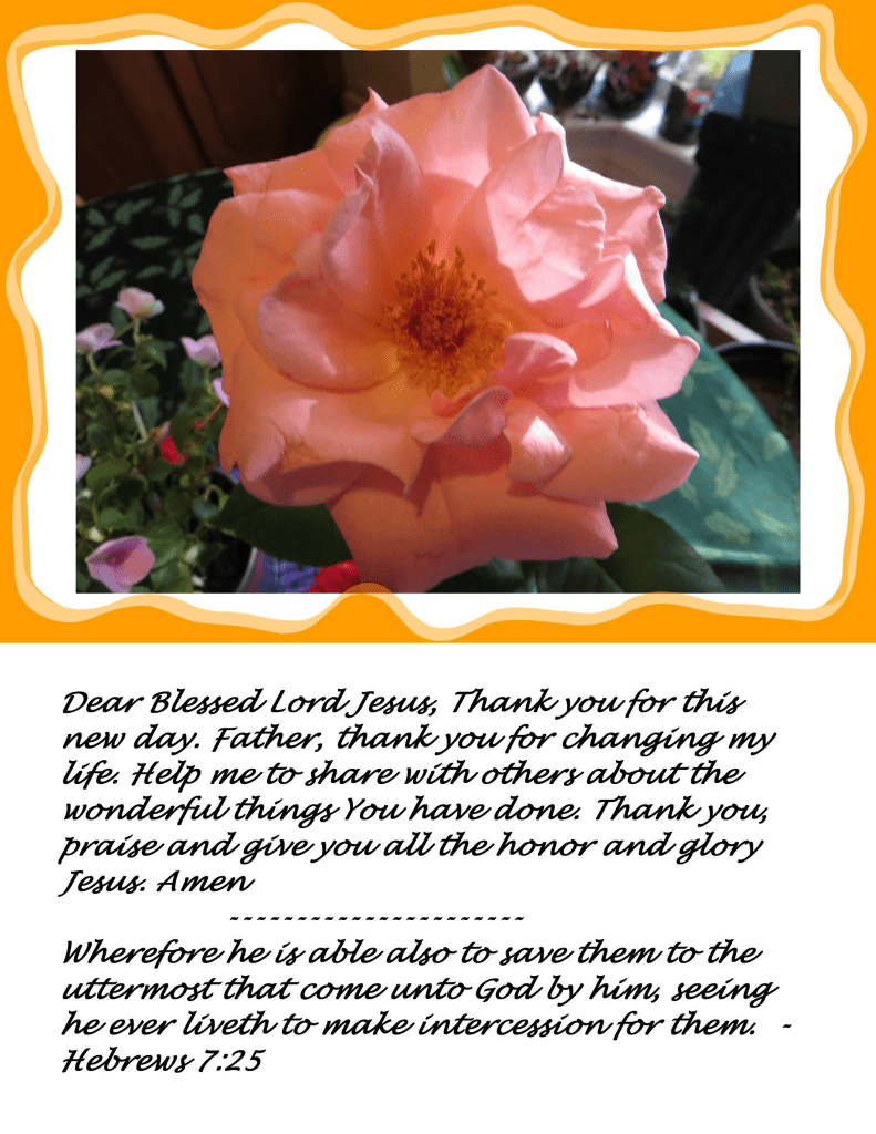 Dear Blessed Lord Jesus, Thank you for this new day. Father, thank you for changing my life. Help me to share with others about the wonderful things You have done. Thank you, praise and give you all the honor and glory Jesus. Amen