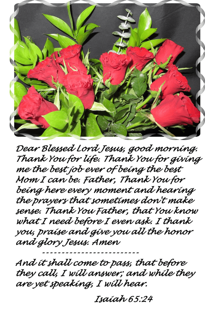 Dear Blessed Lord Jesus, good morning. Thank You for life. Thank You for giving me the best job ever of being the best Mom I can be. Father, Thank You for being here every moment and hearing the prayers that sometimes don’t make sense. Thank You Father, that You know what I need before I even ask. I thank you, praise and give you all the honor and glory Jesus. Amen.