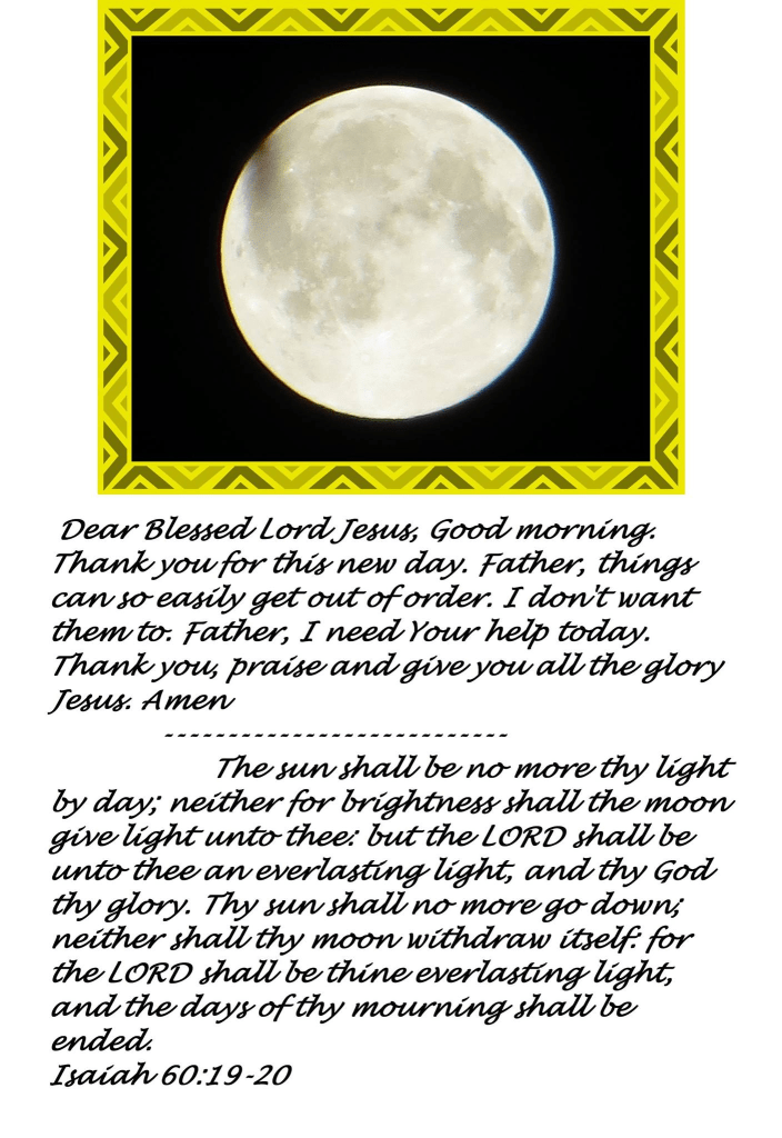 Dear Blessed Lord Jesus, Good morning. Thank you for this new day. Father, things can so easily get out of order. I don’t want them to. Father, I need Your help today. Thank you, praise and give you all the glory Jesus. Amen.