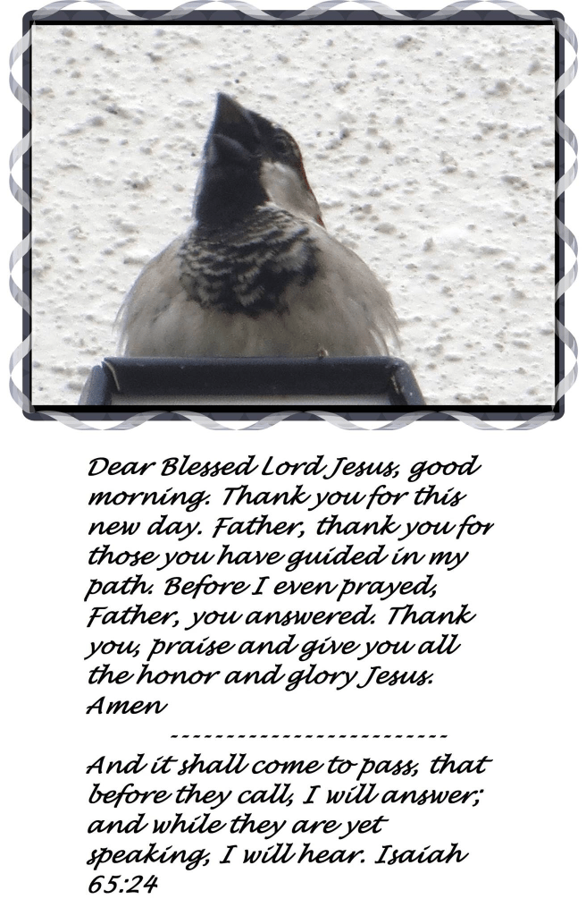 Dear Blessed Lord Jesus, good morning. Thank you for this new day. Father, thank you for those you have guided in my path. Before I even prayed, Father, you answered. Thank you, praise and give you all the honor and glory Jesus. Amen