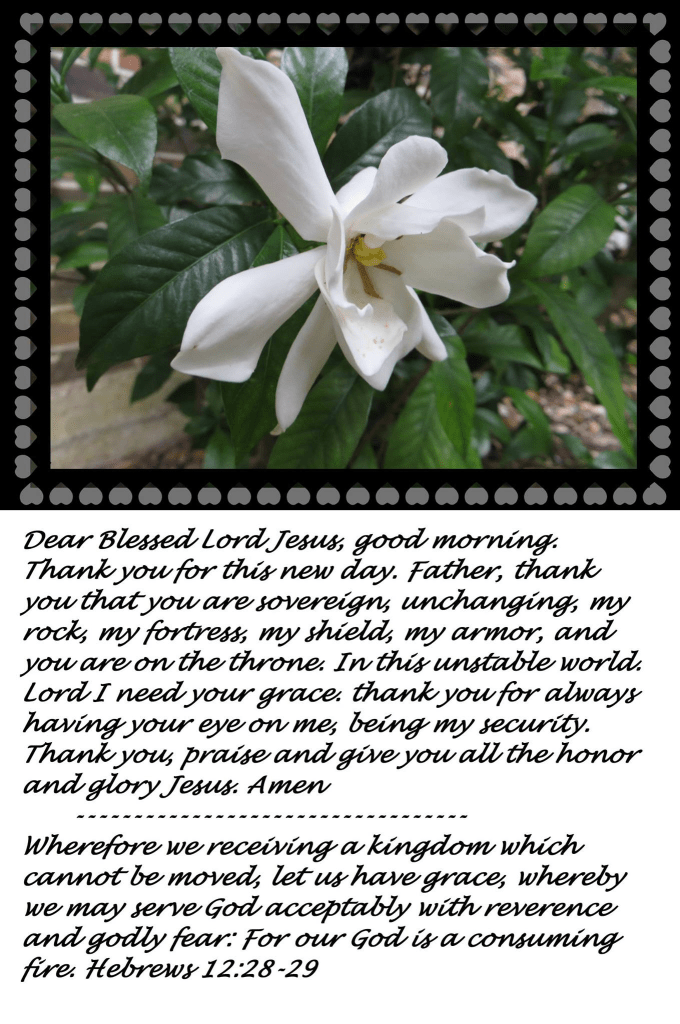 Dear Blessed Lord Jesus, good morning. Thank you for this new day. Father, thank you that you are sovereign, unchanging, my rock, my fortress, my shield, my armor, and you are on the throne. In this unstable world. Lord I need your grace. thank you for always having your eye on me, being my security. Thank you, praise and give you all the honor and glory Jesus. Amen