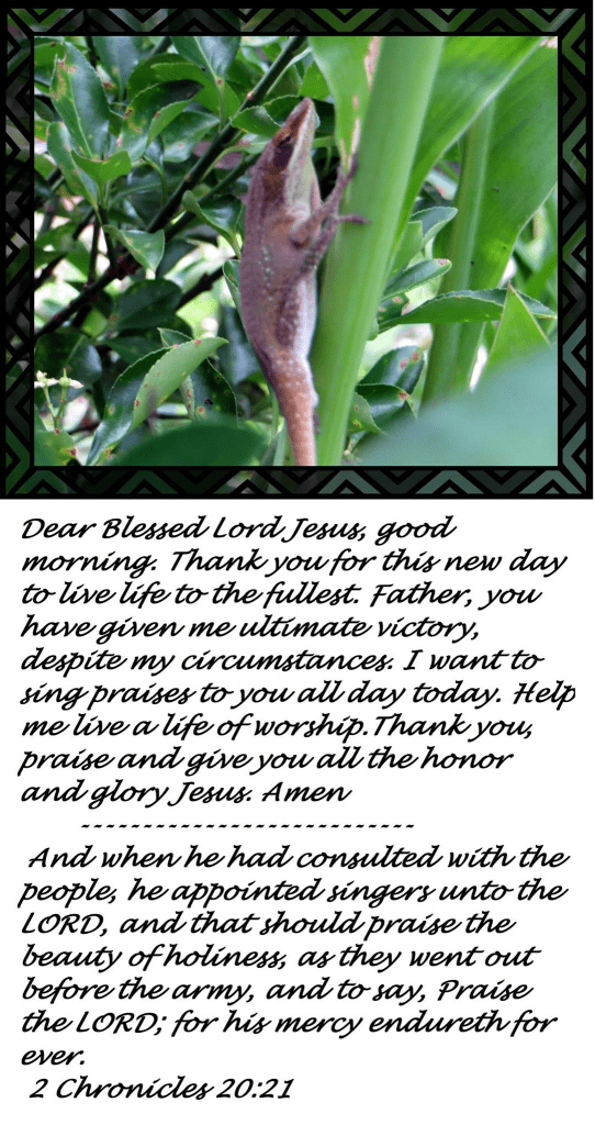 Dear Blessed Lord Jesus, good morning. Thank you for this new day to live life to the fullest. Father, you have given me ultimate victory, despite my circumstances. I want to sing praises to you all day today. Help me live a life of worship.Thank you, praise and give you all the honor and glory Jesus. Amen