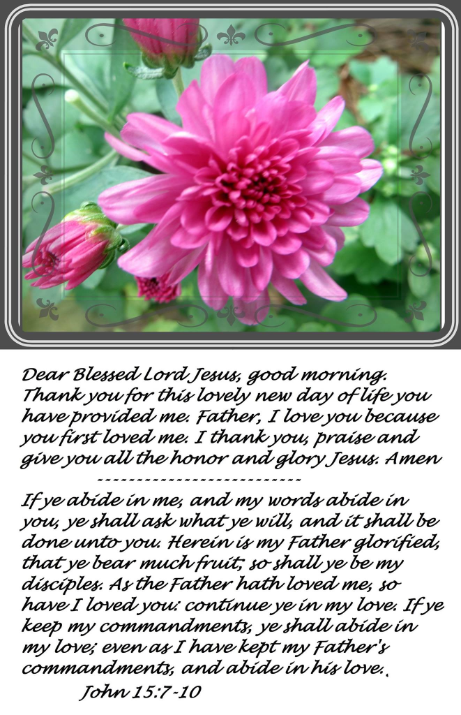Dear Blessed Lord Jesus, good morning. Thank you for this lovely new day of life you have provided me. Father, I love you because you first loved me. I thank you, praise and give you all the honor and glory Jesus. Amen
