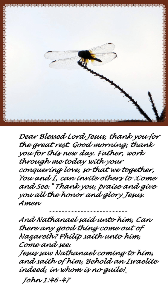 Dear Blessed Lord Jesus, thank you for the great rest. Good morning, thank you for this new day. Father, work through me today with your conquering love, so that we together, You and I, can invite others to :Come and See.” Thank you, praise and give you all the honor and glory Jesus. Amen