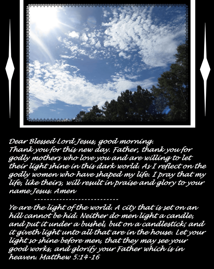 Thank you for this new day. Father, thank you for godly mothers who love you and are willing to let their light shine in this dark world. As I reflect on the godly women who have shaped my life. I pray that my life, like theirs, will result in praise and glory to your name Jesus. Amen