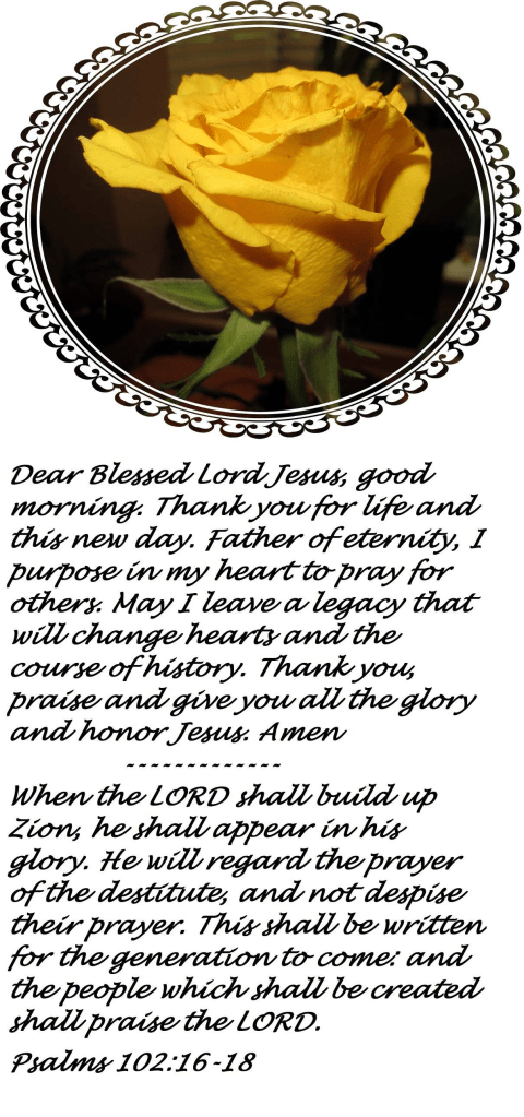 Dear blessed Lord Jesus, good morning. Thank you for life and this new day. Father of eternity, I purpose in my heart to pray for others. May I leave a legacy that will change hearts and the course of history. Thank you, praise and give you all the glory and honor Jesus. Amen