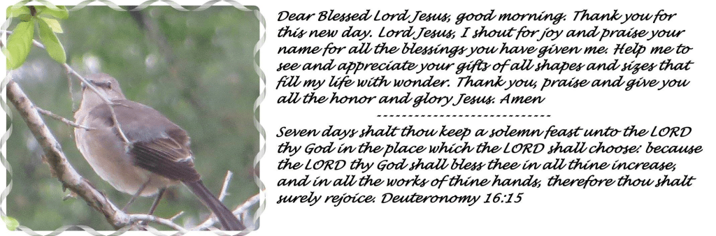 Dear Blessed Lord Jesus, good morning. Thank you for this new day. Lord Jesus, I shout for joy and praise your name for all the blessings you have given me. Help me to see and appreciate your gifts of all shapes and sizes that fill my life with wonder. Thank you, praise and give you all the honor and glory Jesus. Amen
