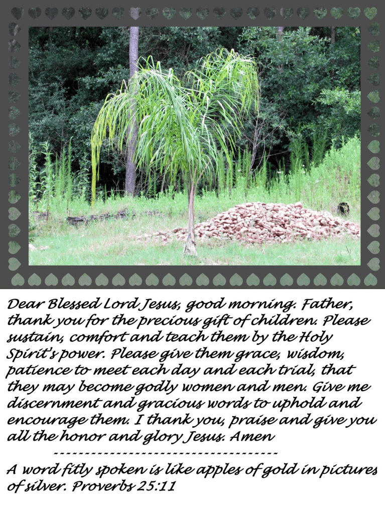 Dear Blessed Lord Jesus, good morning. Father, thank you for the precious gift of children. Please sustain, comfort and teach them by the Holy Spirit’s power. Please give them grace, wisdom, patience to meet each day and each trial, that they may become godly women and men. Give me discernment and gracious words to uphold and encourage them. I thank you, praise and give you all the honor and glory Jesus. Amen