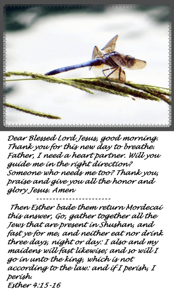 Dear Blessed Lord Jesus, good morning. Thank you for this new day to breathe. Father, I need a heart partner. Will you guide me in the right direction? Someone who needs me too? Thank you, praise and give you all the honor and glory Jesus. Amen