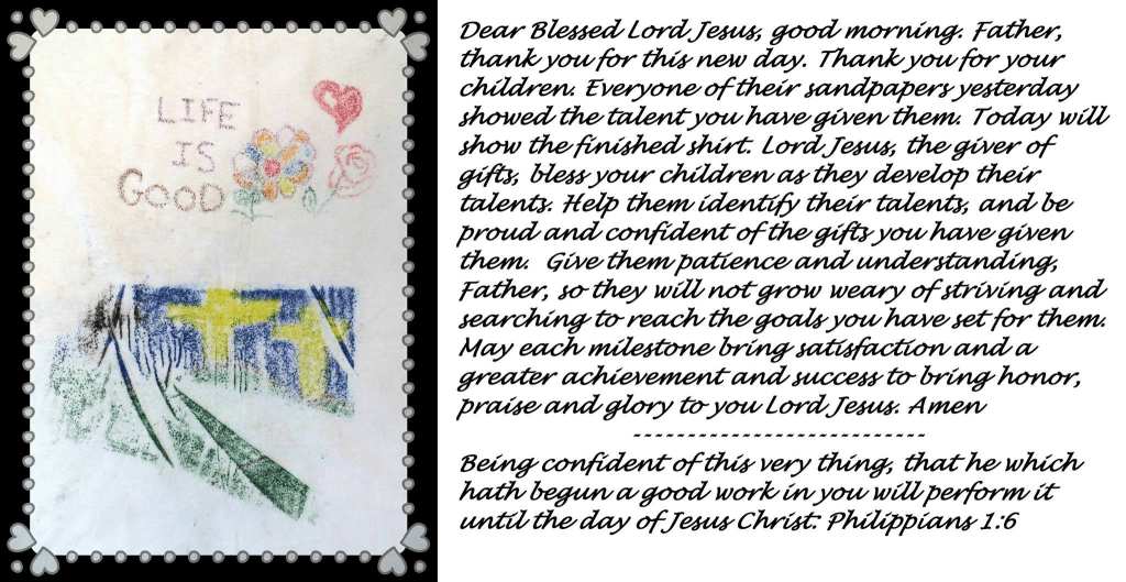 Dear Blessed Lord Jesus, good morning. Father, thank you for this new day. Thank you for your children. Everyone of their sandpapers yesterday showed the talent you have given them. Today will show the finished shirt. Lord Jesus, the giver of gifts, bless your children as they develop their talents. Help them identify their talents, and be proud and confident of the gifts you have given them. Give them patience and understanding, Father, so they will not grow weary of striving and searching to reach the goals you have set for them. May each milestone bring satisfaction and a greater achievement and success to bring honor, praise and glory to you Lord Jesus. Amen