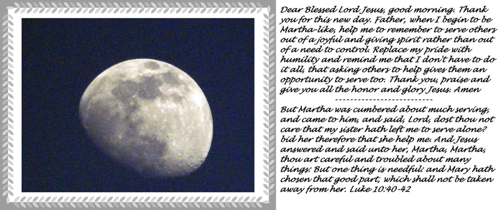 Dear Blessed Lord Jesus, good morning. Thank you for this new day. Father, when I begin to be Martha-like, help me to remember to serve others out of a joyful and giving spirit rather than out of a need to control. Replace my pride with humility and remind me that I don’t have to do it all, that asking others to help gives them an opportunity to serve too. Thank you, praise and give you all the honor and glory Jesus. Amen