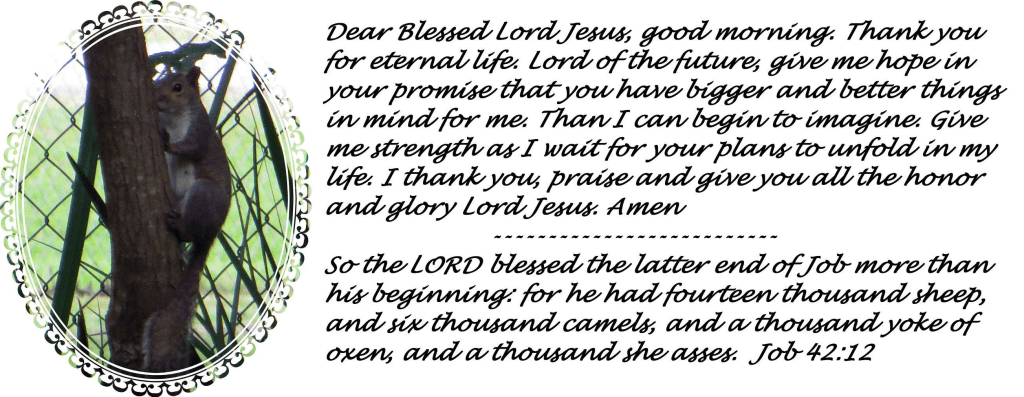 Dear Blessed Lord Jesus, good morning. Thank you for eternal life. Lord of the future, give me hope in your promise that you have bigger and better things in mind for me. Than I can begin to imagine. Give me strength as I wait for your plans to unfold in my life. I thank you, praise and give you all the honor and glory Lord Jesus. Amen