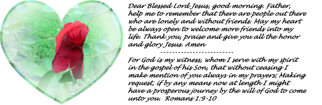 Dear Blessed Lord Jesus, good morning. Father, help me to remember that there are people out there who are lonely and without friends. May my heart be always open to welcome more friends into my life. Thank you, praise and give you all the honor and glory Jesus. Amen