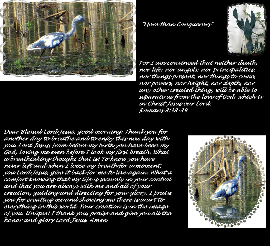 Dear Blessed Lord Jesus, good morning. “More than Conquerors “Thank You for another day to breathe and to enjoy this new day with you. Lord Jesus, from before my birth you have been my God, loving me even before I took my first breath. What a breathtaking thought that is! To know you have never left and when I lose my breath for a moment, you Lord Jesus, give it back for me to live again. What a comfort knowing that my life is securely in your control and that you are always with me and all of your creation, guiding and directing for your glory. I praise you for creating me and showing me there is a art to everything in this world. Your creation is in the image of you. Unique! I thank you, praise and give you all the honor and glory Lord Jesus. Amen.