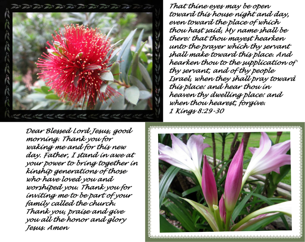 Dear Blessed Lord Jesus, good morning. Thank you for waking me and for this new day. Father, I stand in awe at your power to bring together in kinship generations of those who have loved you and worshiped you. Thank you for inviting me to be part of your family called the church. Thank you, praise and give you all the honor and glory Jesus. Amen.