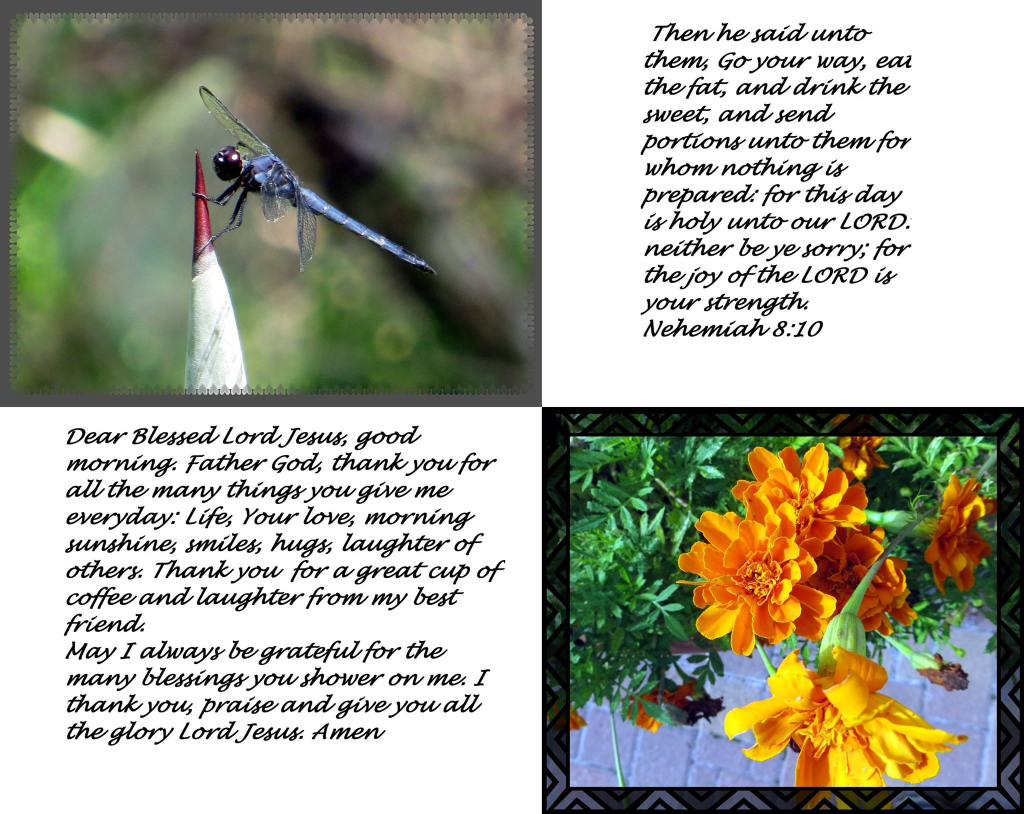 Dear Blessed Lord Jesus, good morning. Father God, thank you for all the many things you give me everyday: Life, Your love, morning sunshine, smiles, hugs, laughter of others. Thank you for a great cup of coffee and laughter from my best friend.