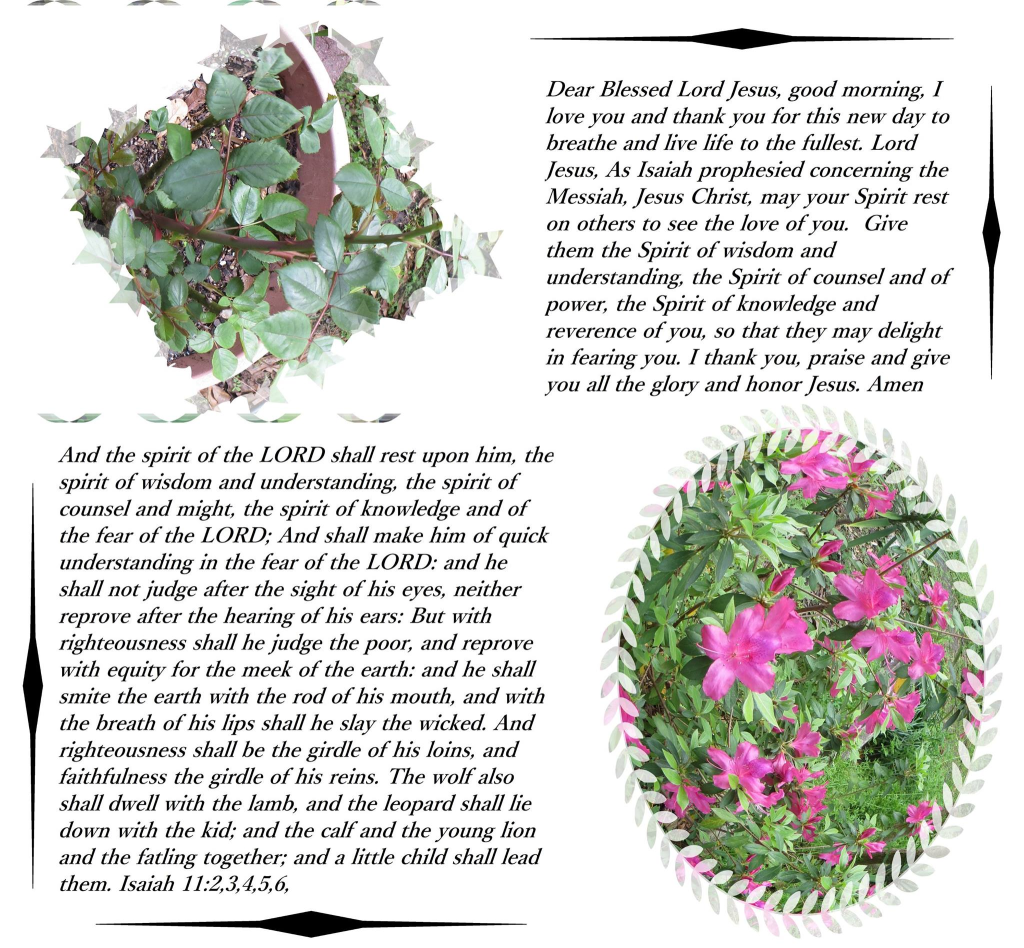 Dear Blessed Lord Jesus, good morning, I love you and thank you for this new day to breathe and live life to the fullest. Lord Jesus, As Isaiah prophesied concerning the Messiah, Jesus Christ, may your Spirit rest on others to see the love of you. Give them the Spirit of wisdom and understanding, the Spirit of counsel and of power, the Spirit of knowledge and reverence of you, so that they may delight in fearing you. I thank you, praise and give you all the glory and honor Jesus. Amen.