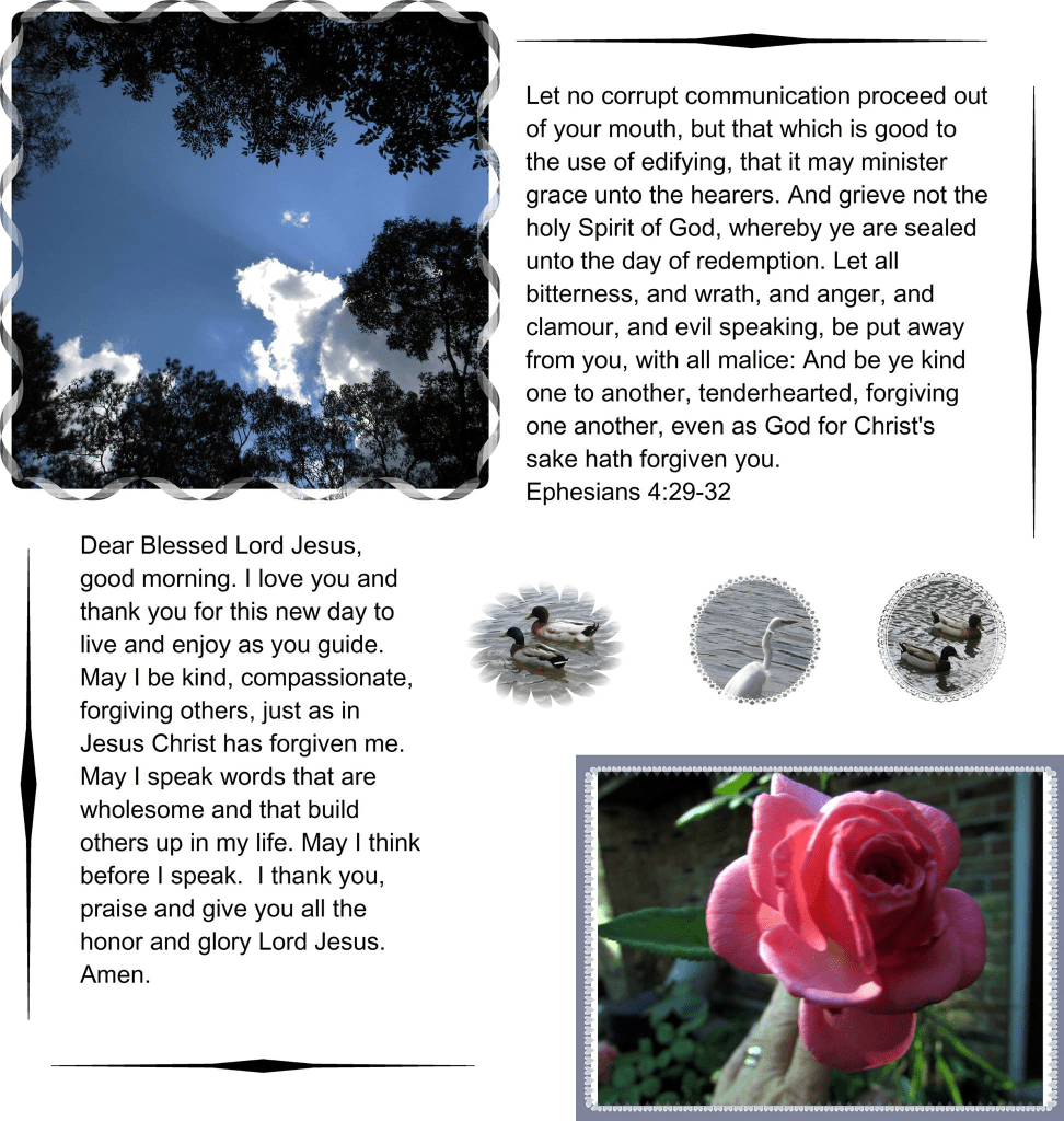 Dear Blessed Lord Jesus, good morning. I love you and thank you for this new day to live and enjoy as you guide. May I be kind, compassionate, forgiving others, just as in Jesus Christ has forgiven me. May I speak words that are wholesome and that build others up in my life. May I think before I speak. I thank you, praise and give you all the honor and glory Lord Jesus. Amen.