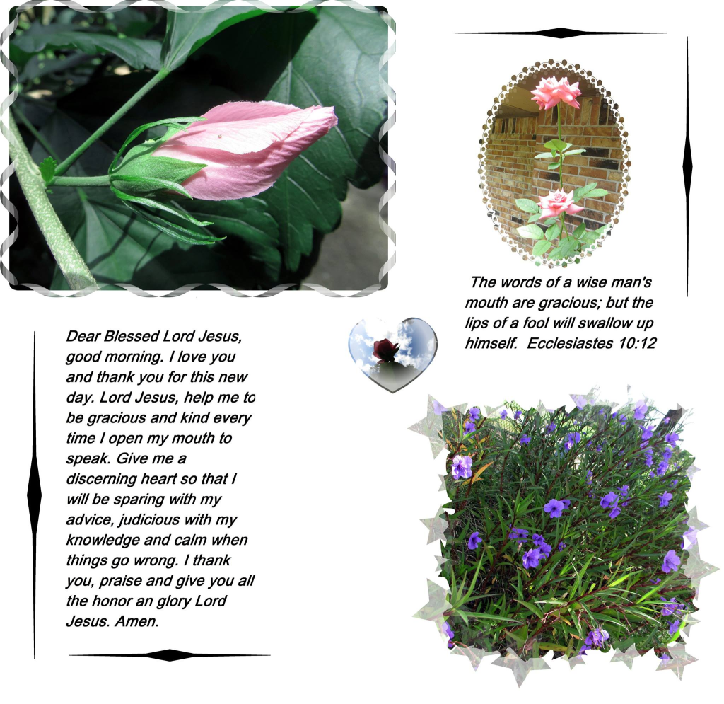 Dear Blessed Lord Jesus, good morning. I love you and thank you for this new day. Lord Jesus, help me to be gracious and kind every time I open my mouth to speak. Give me a discerning heart so that I will be sparing with my advice, judicious with my knowledge and calm when things go wrong. I thank you, praise and give you all the honor an glory Lord Jesus. Amen.
