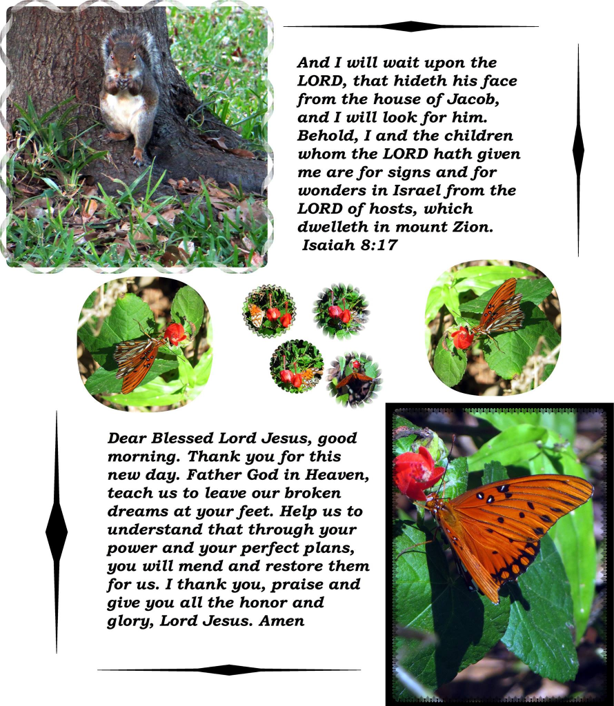 Dear Blessed Lord Jesus, good morning. Thank you for this new day. Father God in Heaven, teach us to leave our broken dreams at your feet. Help us to understand that through your power and your perfect plans, you will mend and restore them for us. I thank you, praise and give you all the honor and glory, Lord Jesus. Amen.