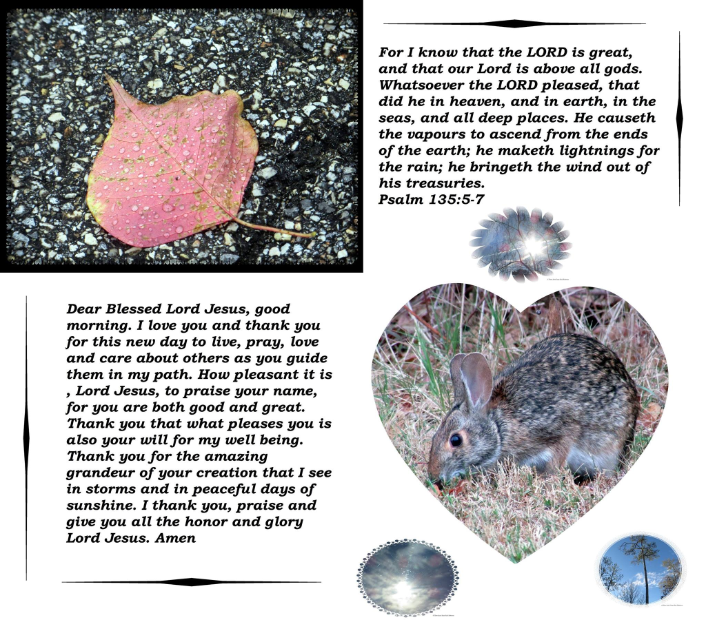 Dear Blessed Lord Jesus, good morning. I love you and thank you for this new day to live, pray, love and care about others as you guide them in my path. How pleasant it is , Lord Jesus, to praise your name, for you are both good and great. Thank you that what pleases you is also your will for my well being. Thank you for the amazing grandeur of your creation that I see in storms and in peaceful days of sunshine. I thank you, praise and give you all the honor and glory Lord Jesus. Amen.