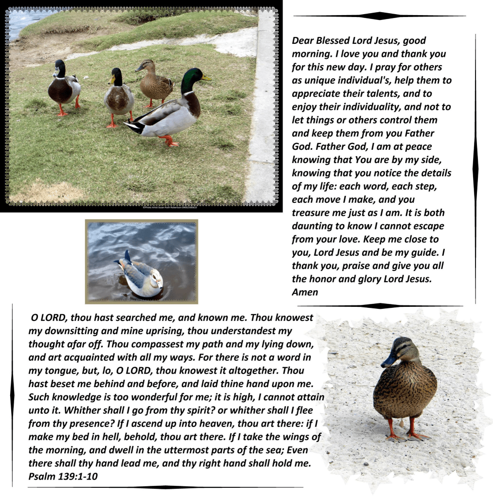 Dear Blessed Lord Jesus, good morning. I love you and thank you for this new day. I pray for others as unique individual’s, help them to appreciate their talents, and to enjoy their individuality, and not to let things or others control them and keep them from you Father God. Father God, I am at peace knowing that You are by my side, knowing that you notice the details of my life: each word, each step, each move I make, and you treasure me just as I am. It is both daunting to know I cannot escape from your love. Keep me close to you, Lord Jesus and be my guide. I thank you, praise and give you all the honor and glory Lord Jesus. Amen.