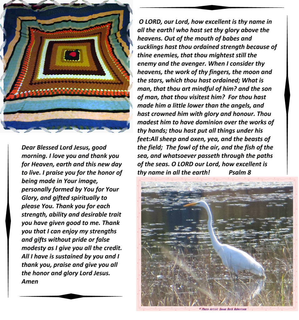 Dear Blessed Lord Jesus, good morning. I love you and thank you for Heaven, earth and this new day to live. I praise you for the honor of being made in Your image, personally formed by You for Your Glory, and gifted spiritually to please You. Thank you for each strength, ability and desirable trait you have given good to me. Thank you that I can enjoy my strengths and gifts without pride or false modesty as I give you all the credit. All I have is sustained by you and I thank you, praise and give you all the honor and glory Lord Jesus. Amen.