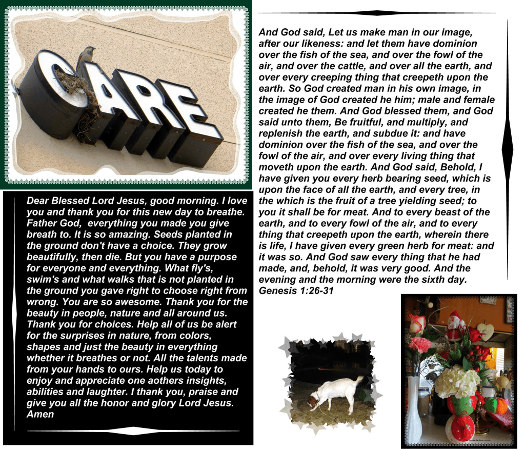 Dear Blessed Lord Jesus, good morning. I love you and thank you for this new day to breathe. Father God, everything you made you give breath to. It is so amazing. Seeds planted in the ground don’t have a choice. They grow beautifully, then die. But you have a purpose for everyone and everything. What fly’s, swims and what walks that is not planted in the ground you gave right to choose right from wrong. You are so awesome. Thank you for the beauty in people, nature and all around us. Thank you for choices. Help all of us be alert for the surprises in nature, from colors, shapes and just the beauty in everything whether it breathes or not. All the talents made from your hands to ours. Help us today to enjoy and appreciate one anthers insights, abilities and laughter. I thank you, praise and give you all the honor and glory Lord Jesus. Amen.