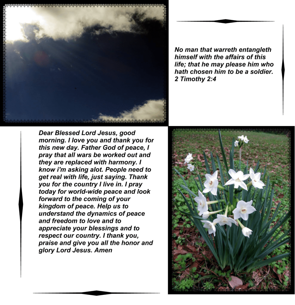 Dear Blessed Lord Jesus, good morning. I love you and thank you for this new day. Father God of peace, I pray that all wars be worked out and they are replaced with harmony. I know I’m asking alot. People need to get real with life, just saying. Thank you for the country I live in. I pray today for world-wide peace and look forward to the coming of your kingdom of peace. Help us to understand the dynamics of peace and freedom to love and to appreciate your blessings and to respect our country. I thank you, praise and give you all the honor and glory Lord Jesus. Amen.
