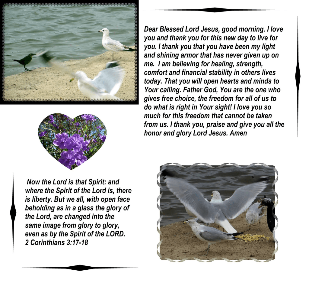 Dear Blessed Lord Jesus, good morning. I love you and thank you for this new day to live for you. I thank you that you have been my light and shining armor that has never given up on me. I am believing for healing, strength, comfort and financial stability in others lives today. That you will open hearts and minds to Your calling. Father God, You are the one who gives free choice, the freedom for all of us to do what is right in Your sight! I love you so much for this freedom that cannot be taken from us. I thank you, praise and give you all the honor and glory Lord Jesus. Amen.