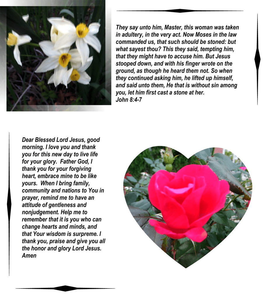 Dear Blessed Lord Jesus, good morning. I love you and thank you for this new day to live life for your glory. Father God, I thank you for your forgiving heart, embrace mine to be like yours. When I bring family, community and nations to You in prayer, remind me to have an attitude of gentleness and nonjudgement. Help me to remember that it is you who can change hearts and minds, and that Your wisdom is Supreme. I thank you, praise and give you all the honor and glory Lord Jesus. Amen.