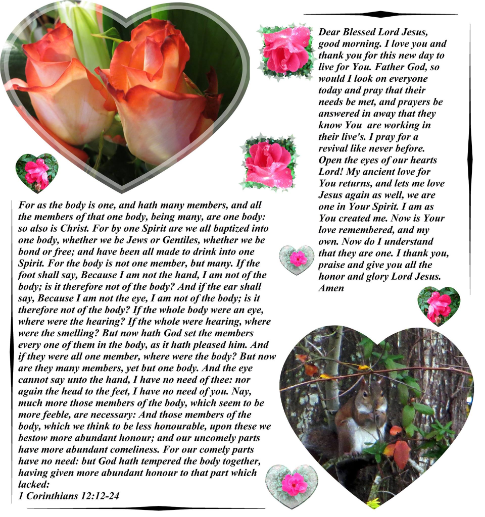 For as the body is one, and hath many members, and all the members of that one body, being many, are one body: so also is Christ. For by one Spirit are we all baptized into one body, whether we be Jews or Gentiles, whether we be bond or free; and have been all made to drink into one Spirit. For the body is not one member, but many. If the foot shall say, Because I am not the hand, I am not of the body; is it therefore not of the body? And if the ear shall say, Because I am not the eye, I am not of the body; is it therefore not of the body? If the whole body were an eye, where were the hearing? If the whole were hearing, where were the smelling? But now hath God set the members every one of them in the body, as it hath pleased him. And if they were all one member, where were the body? But now are they many members, yet but one body. And the eye cannot say unto the hand, I have no need of thee: nor again the head to the feet, I have no need of you. Nay, much more those members of the body, which seem to be more feeble, are necessary: And those members of the body, which we think to be less honourable, upon these we bestow more abundant honour; and our uncomely parts have more abundant comeliness. For our comely parts have no need: but God hath tempered the body together, having given more abundant honour to that part which lacked: 1 Corinthians 12:12-24