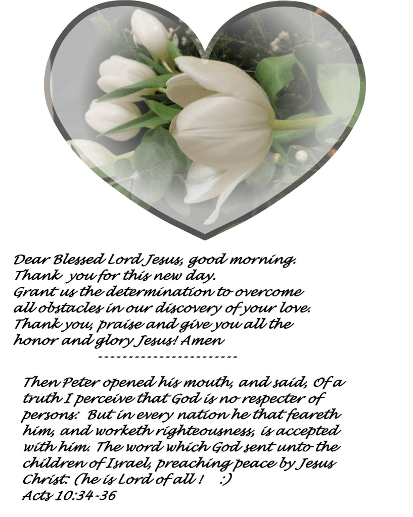 Acts 10:34-36 Then Peter opened his mouth, and said, Of a truth I perceive that God is no respecter of persons: But in every nation he that feareth him, and worketh righteousness, is accepted with him.