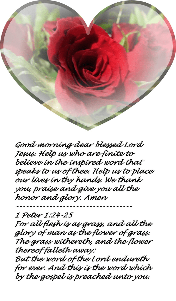 Good morning Dear Blessed Lord Jesus. Help us who are finite to believe in the inspired word that speaks to us of thee. Help us to place our lives in thy hands. We thank you, praise and give you all the honor and glory. Amen.