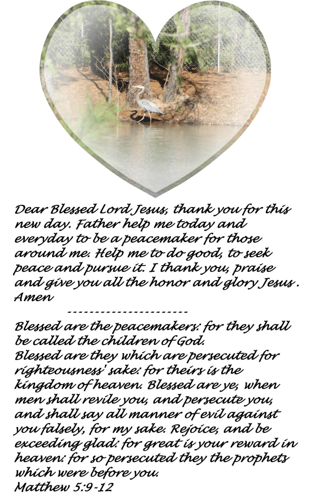 Dear Blessed Lord Jesus, thank you for this new day. Father help me today and everyday to be a peacemaker for those around me. Help me to do good, to seek peace and pursue it. I thank you, praise and give you all the honor and glory Jesus . Amen
