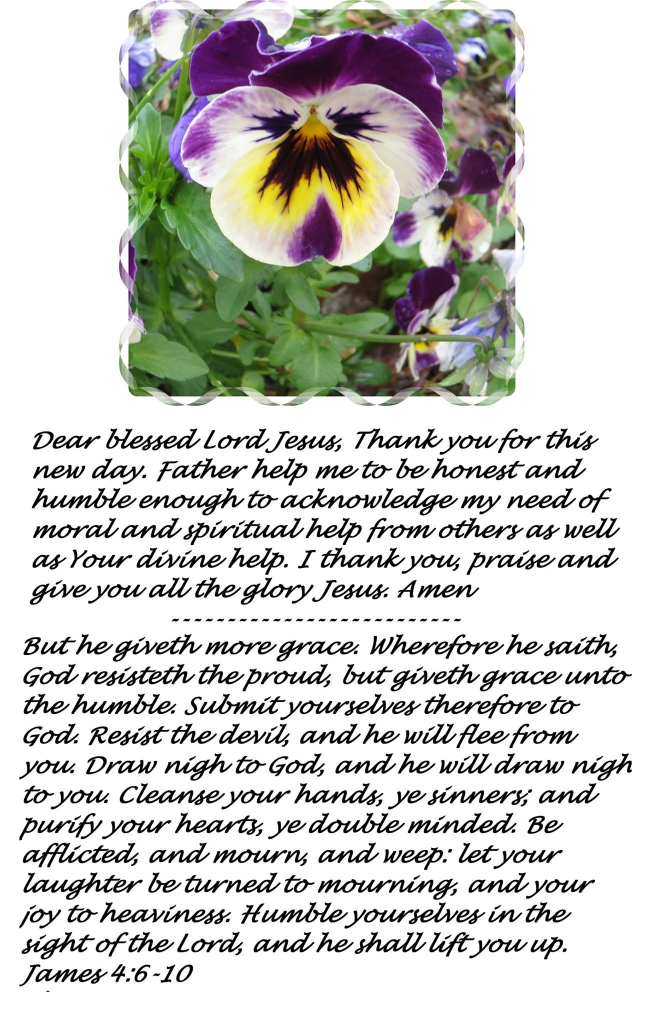 Dear Blessed Lord Jesus, Thank you for this new day. Father help me to be honest and humble myself enough to acknowledge my need of moral and spiritual help from others as well as your divine help. I thank you, praise and give you all the honor and glory Jesus. Amen